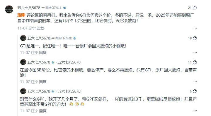 在当今国6B阶段,比它贵的小钢炮,要么停产,要么不再放炮,只有GTI,原厂回火放炮,自带声浪!别管什么GPF,我开了几个月了,带GPF又怎样,一样的转速过3千,噼里啪啦尽情放炮!并且声音甚至比不带GPF的还大!
