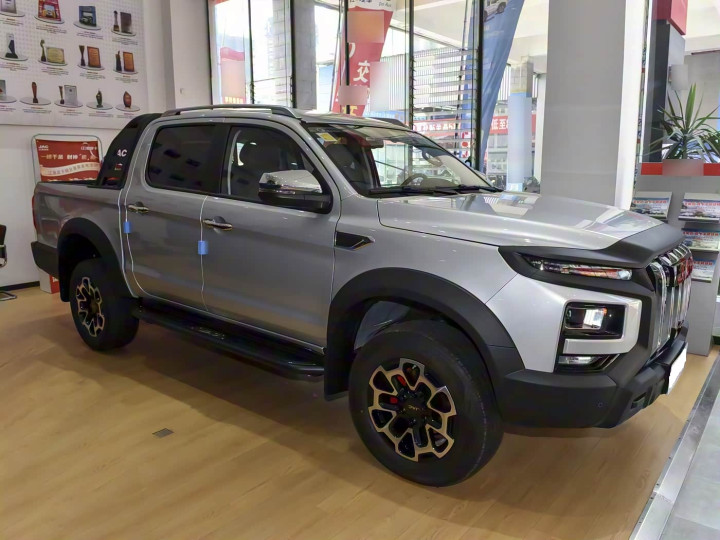 再来看车身侧面部分,车身尺寸为5330/5620×1965×1920mm(长轴/标轴),轴距3110/3400mm,宽体设计带来宽裕的内部空间。侧面线条平直硬朗,搭配18寸龙鳞式铝合金轮辋和265/60 R18全地形轮胎,兼顾城市道路与越野场景。车顶配备行李架,最大承重100kg,便于安装帐篷或储物箱。货箱尺寸为1520/1810×1590×470mm,内部喷涂防刮涂层,并标配货箱宝,有效防止货物磨损。隐藏式门把手设计降低风阻系数,提升燃油经济性。