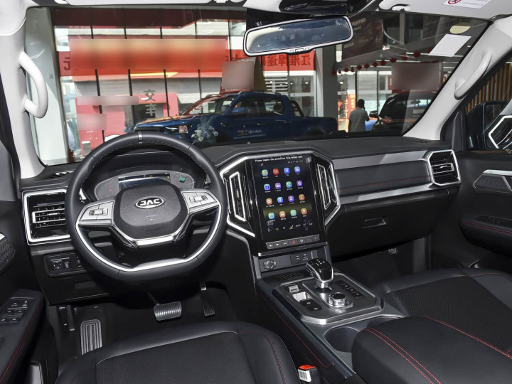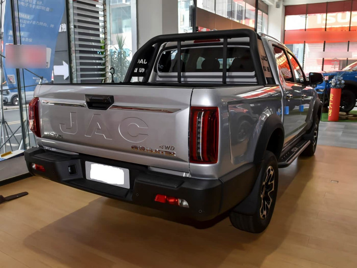 再来看车尾部分,车尾采用方正造型,尾灯组为竖状排列,内部集成LED光源,夜间警示效果突出。后保险杠集成踏板功能,方便上下货箱。货箱尾门支持电动开闭,并配备阻尼缓冲装置,避免关闭时的冲击。后悬架采用多连杆整体桥结构,搭配螺旋弹簧,在重载时仍能保持车身稳定性。整体设计以实用为导向,同时通过细节处理提升质感。