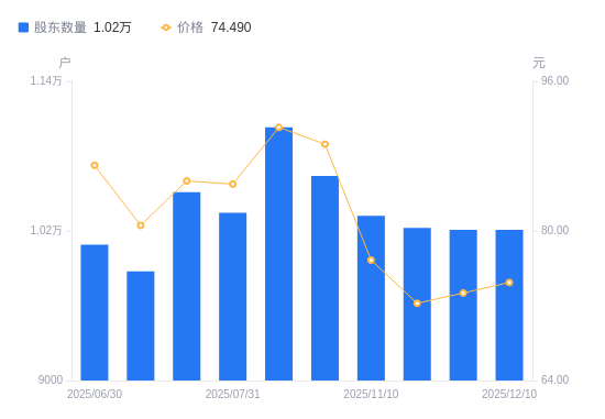 日期A股户数(户)流通A股户均持股数(股)户均持股市值(万元)2025-12-10102093067.5522.852025-11-28102093067.5522.502025-11-20102243063.0522.132025-11-10103223033.9723.332025-09-30106412943.0126.282025-09-19110322838.7125.852025-07-31103463026.9325.732025-07-18105112979.4125.432025-07-1098763170.9825.552025-06-30100903103.7327.01
