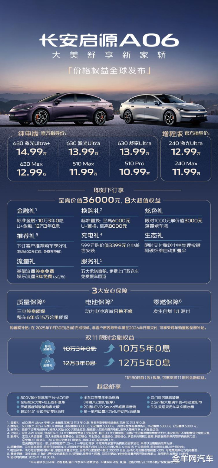 11月9日,长安启源A06价格和权益正式发布,囊括六款纯电车型,及两款增程车型。其中,纯电车型全系价格在先享预订价的基础上下调1万元,官方指导价10.99万元—14.99万元;两款增程车型官方指导价分别为11.99万元和12.99万元。